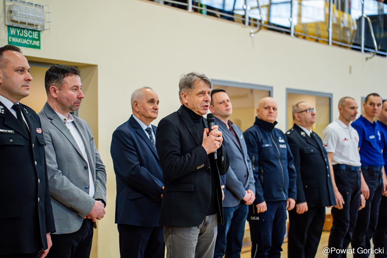 Sygnał do rozpoczęcia halowych zmagań MDP dała dh Wiktoria Ryznar z Młodzieżowej Drużyny Pożarniczej OSP Racławice składając meldunek o gotowości Prezesowi Zarządu Oddziału Powiatowego ZOSP RP w Gorlicach dh Przemysławowi Wszołkowi. Następie Prezes powitał licznie przybyłych a uroczystego otwarcia turnieju dokonał Burmistrz Miasta i Gminy Biecz Mirosław Wędrychowicz