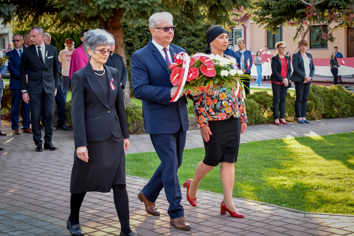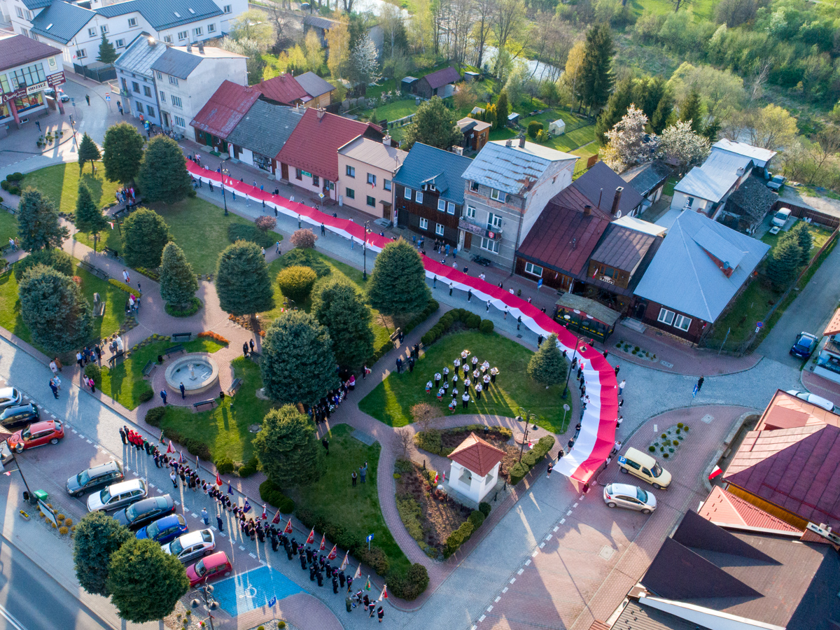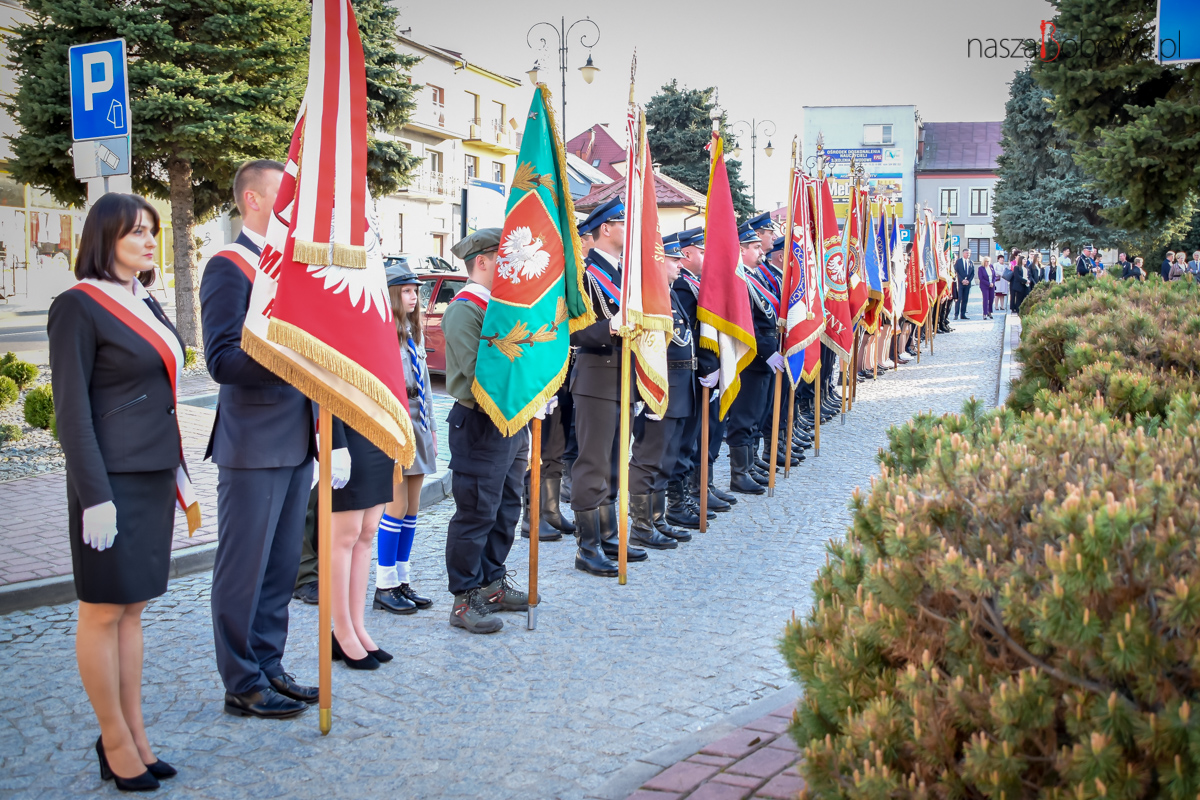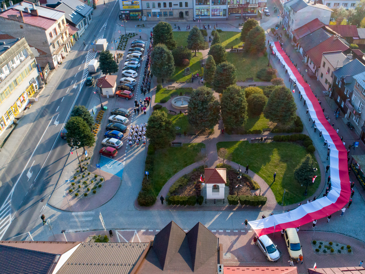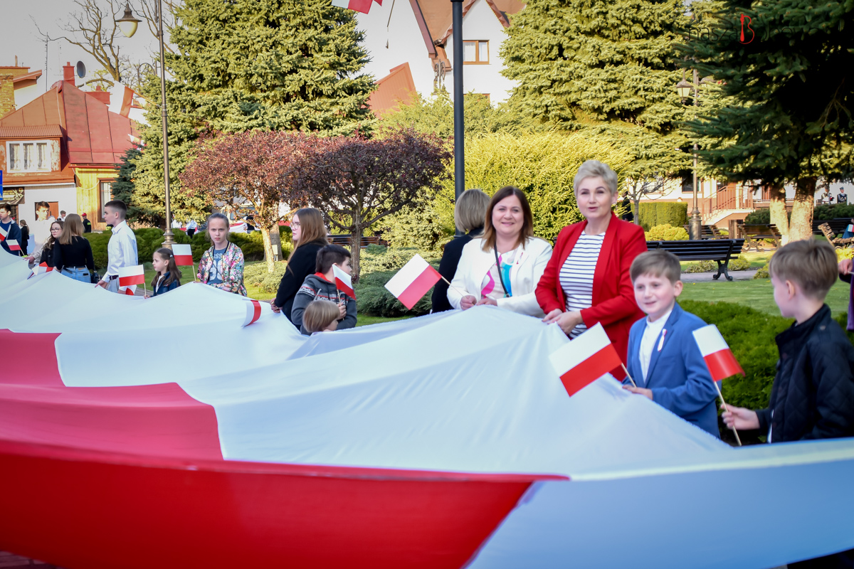 Wokół Rynku mieszkańcy gminy, uczniowie bobowskich szkół, druhowie młodzieżowych jednostek OSP rozwinęli flagę narodową.